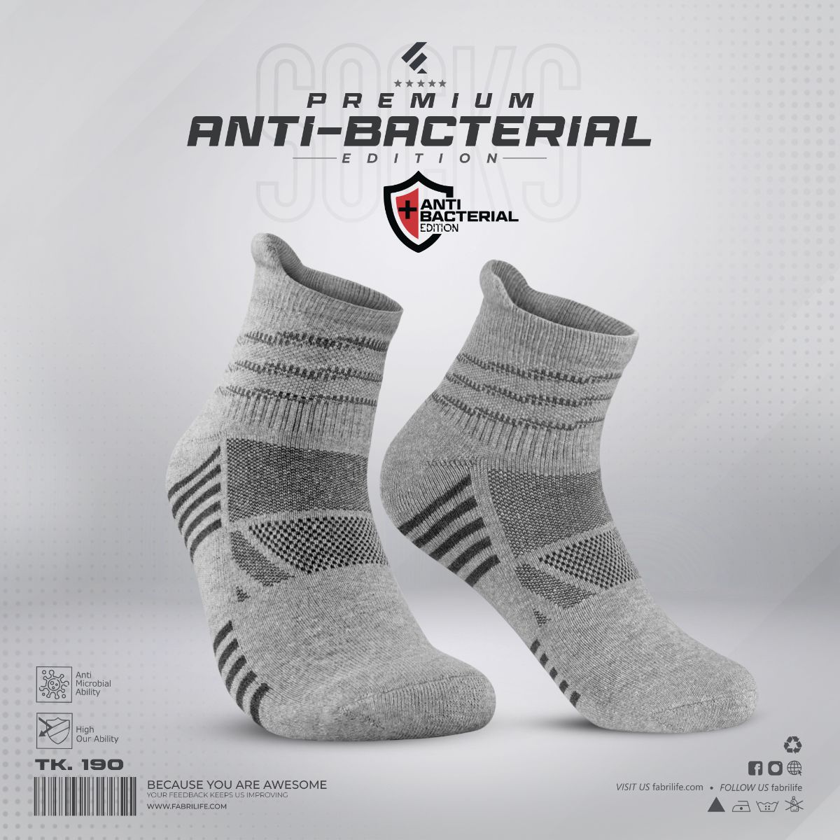 The best quality sock you can find in Bangladesh contains 75% 2 Ply Combed Cotton and 25% Nylon Spandex with antibacterial coating.