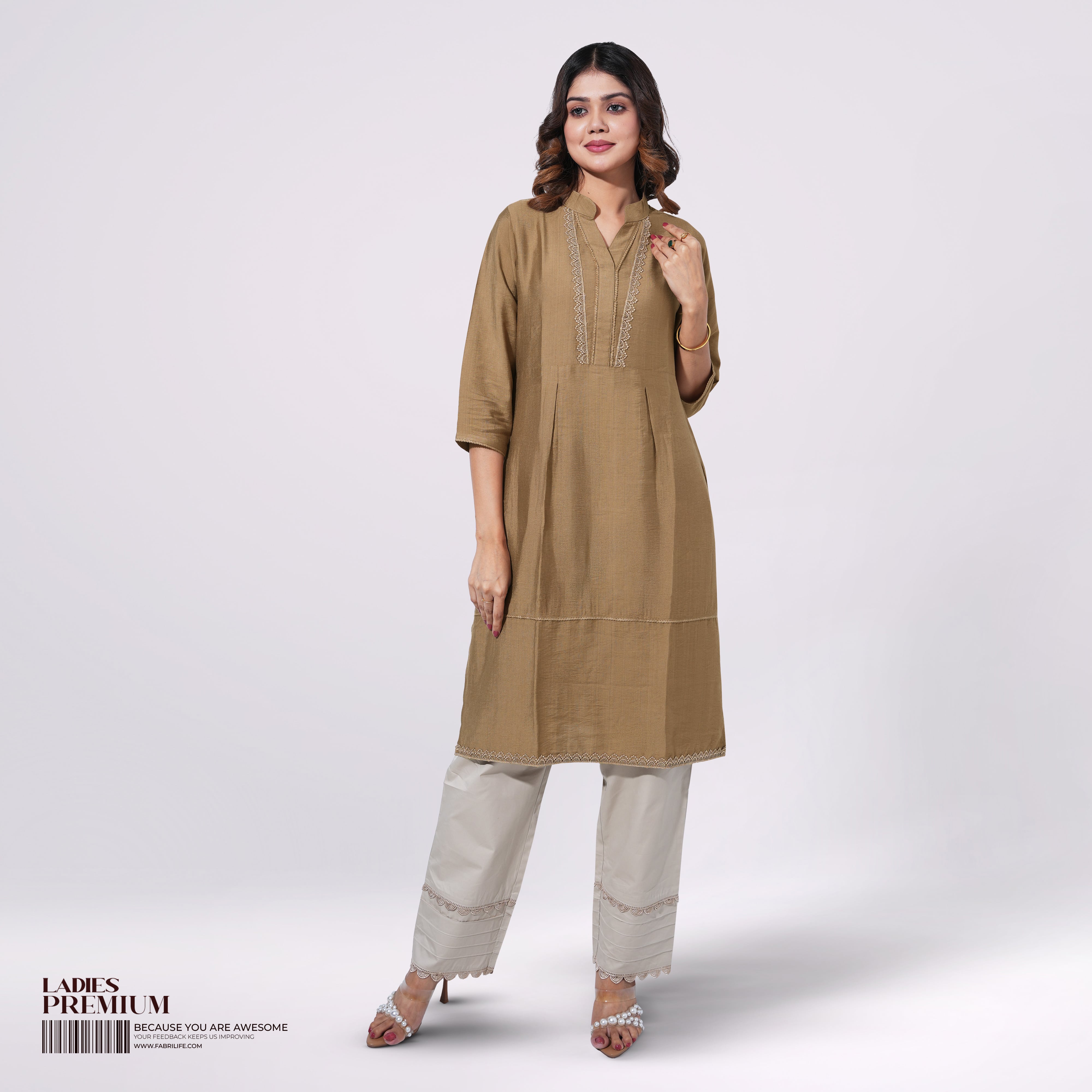 This sophisticated premium kurti showcases an elegant design with meticulous attention to detail, featuring beautiful lace work and premium finishing. The garment combines comfort and style with its breathable fabric blend and classic silhouette, making it perfect for both everyday wear and special occasions. The refined construction ensures durability while maintaining a luxurious feel.