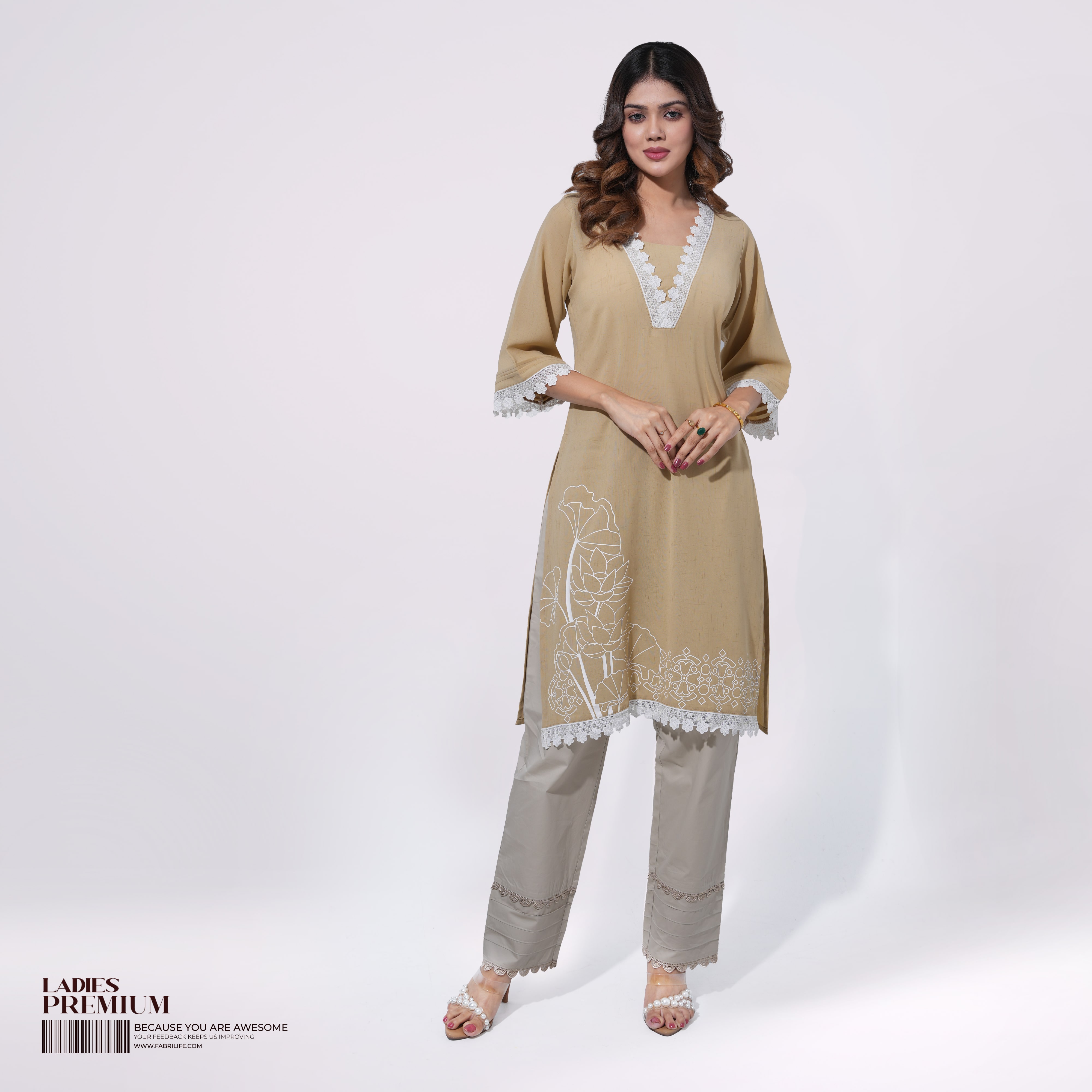 Crafted from premium Georgette fabric, this kurti is designed to provide a lightweight and breathable experience, perfect for all-day wear. The AOP (All Over Print) pattern brings a sense of sophistication, while the intricate lace and embroidery details ensure a premium finish. Whether you're heading to a casual outing or a festive gathering, the Creimenia Kurti keeps you effortlessly chic.